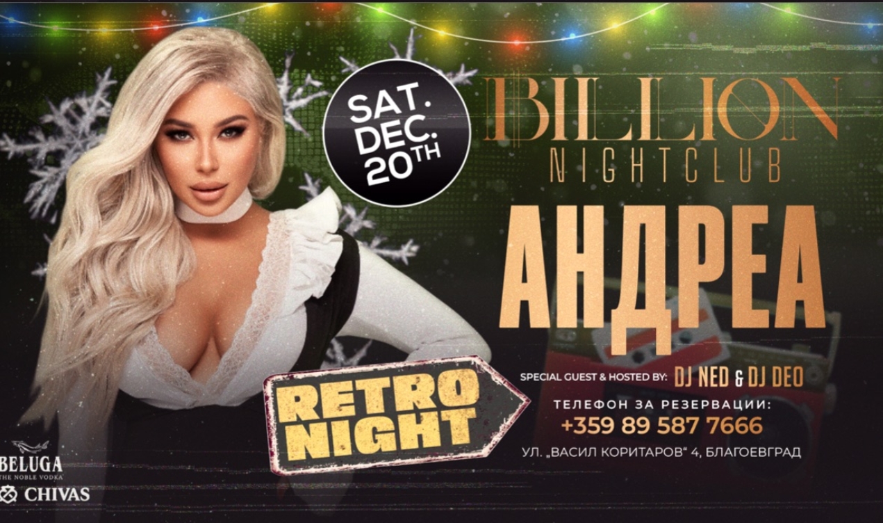 Благоевград се готви за една от най-горещите партита на сезона, защото на 20 декември в клуб Billion Nightclub специален гост ще бъде не кой да е, а самата Андреа. Певицата, която винаги знае как да вдигне градуса на настроението, пристига, за да превърне вечерта в истински празник за феновете си.