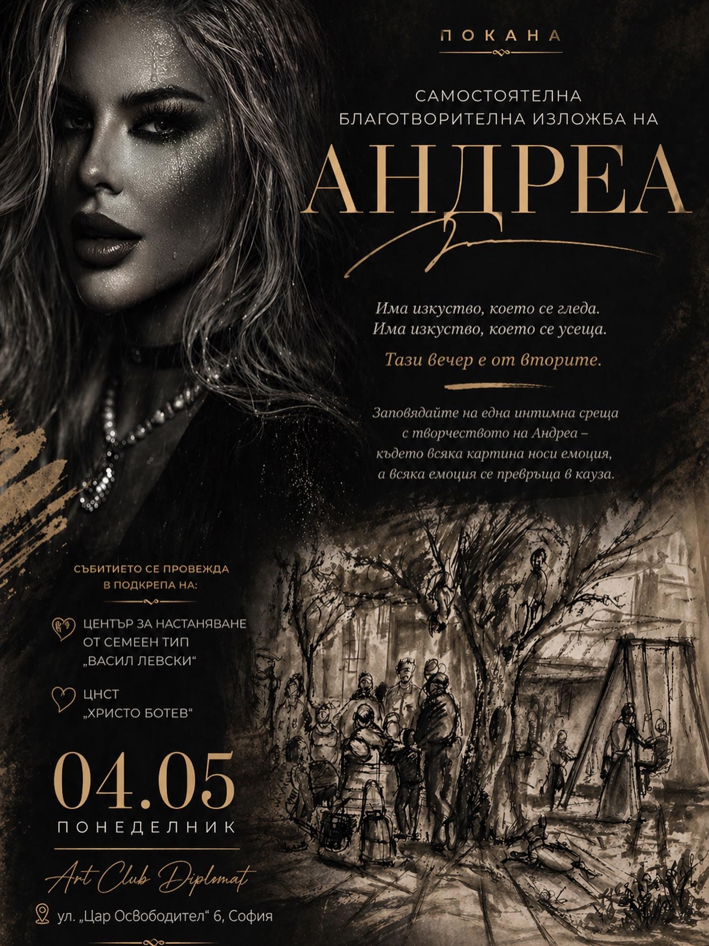​Тази светска вечер обещава да бъде много повече от обикновено откриване на галерия. На ул. „Цар Освободител“ 6, сред изтънчена атмосфера и разговори за изкуство, ще станем свидетели на това как една популярна личност използва силата на своя талант, за да подари надежда. Андреа доказва, че истинският артист никога не спира да търси нови пътища за изразяване, особено когато те водят към едно по-добро и смислено утре.