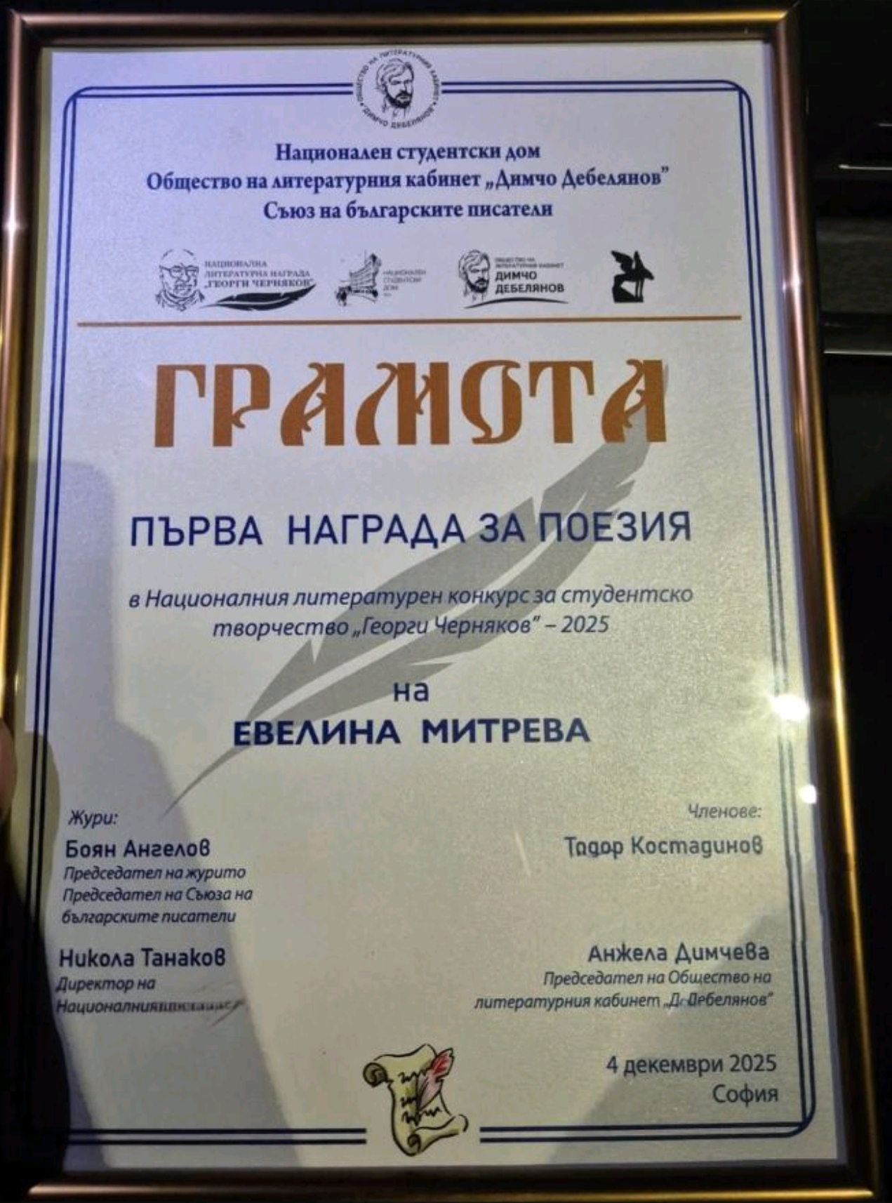 Докторант от Правно-историческия факултет на Югозападния университет „Неофит Рилски“ спечели първа награда в Националния литературен конкурс за студентско творчество „Георги Черняков – 2025“. Евелина Митрева бе отличена в категория „Поезия“ с две свои стихотворения – „До края на света“ и „Благодаря“. Тя е докторант в катедра „Връзки с обществеността“ с научен ръководител доц. д-р Гергана Георгиева.