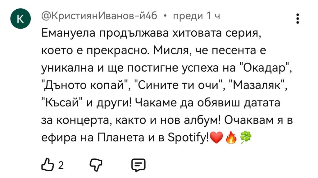 Под видеото вече валят поздравления, комплименти и възторжени коментари. Почитателите на Емануела не спират да я поздравяват за визията, смелостта и факта, че отново е „в десетката“.