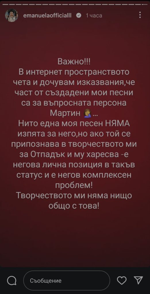Попфолк звездата Емануела използва социалните мрежи, за да внесе яснота относно спекулации, циркулиращи в интернет пространството. В свое Instagram стори тя категорично отрече слуховете, че част от нейните песни са създадени за човек на име Мартин.
