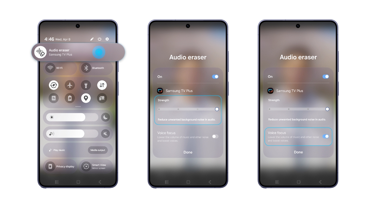 Потребителите могат лесно да регулират шума и да намаляват разсейващите фактори директно от Quick Panel, без да се налага да превъртат назад или да пускат съдържанието отново. След активиране функцията предлага разширени настройки за по-професионален резултат. Чрез плъзгача Strength (Сила на звука) може фино да се настрои нивото на шумопотискане, а с активирането на Voice Focus (Фокусиране на гласа) се осигуряват кристално ясни диалози дори по време на живо излъчване.