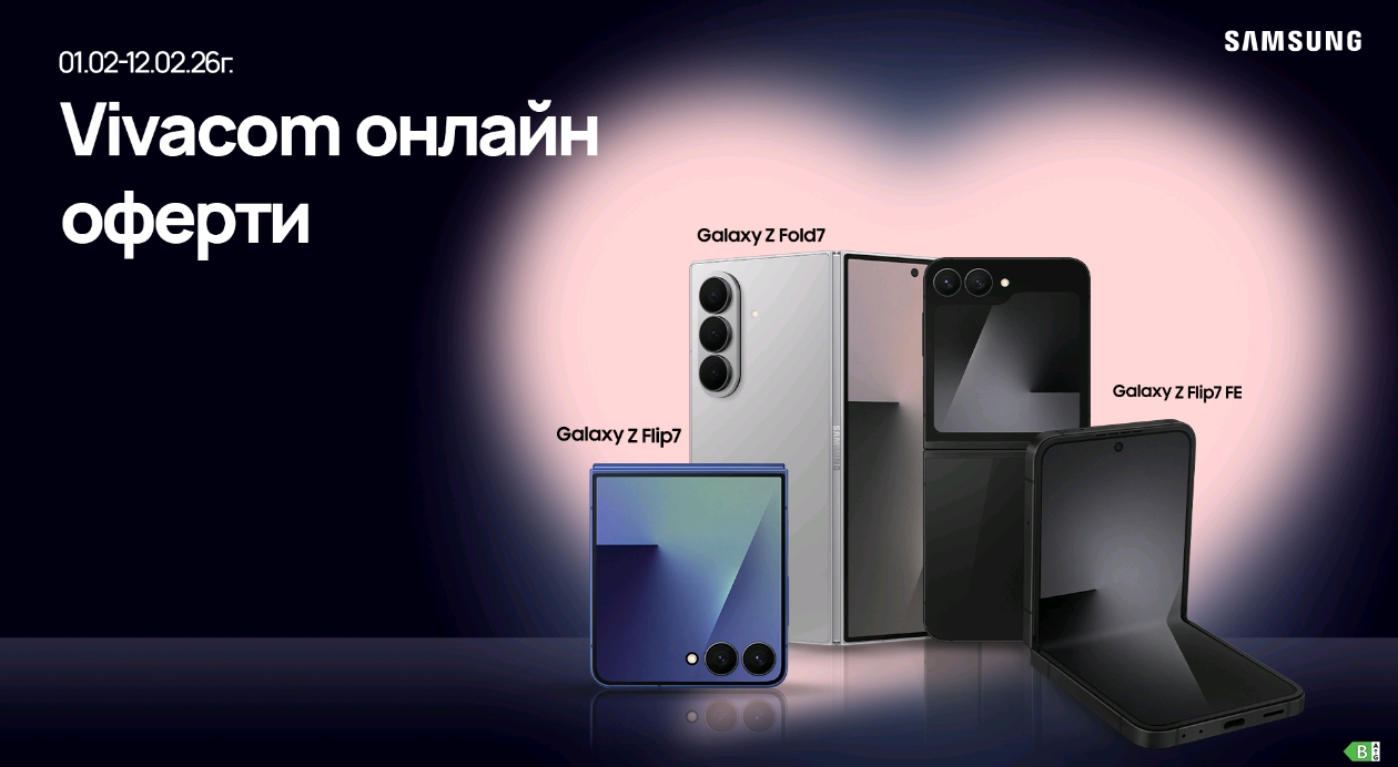Независимо дали празнувате Свети Валентин или просто търсите повод да зарадвате себе си или любим човек, Vivacom стартира специални онлайн атрактивни отстъпки до 300 € | 586.75 лв. за смартфони Samsung в комбинация с план от телекома, валидни при сключване на 24-месечен договор за планове Unlimited. Сред предложенията са най-новите сгъваеми модели Samsung Galaxy Z Fold7, Galaxy Z Flip7 и Galaxy Z Flip7 FE, които съчетават иновативен дизайн, интелигентни функции и стил. Офертата е валидна само онлайн на vivacom.bg до 12 февруари и превръща избора на подарък в лесно, бързо и изгодно решение.