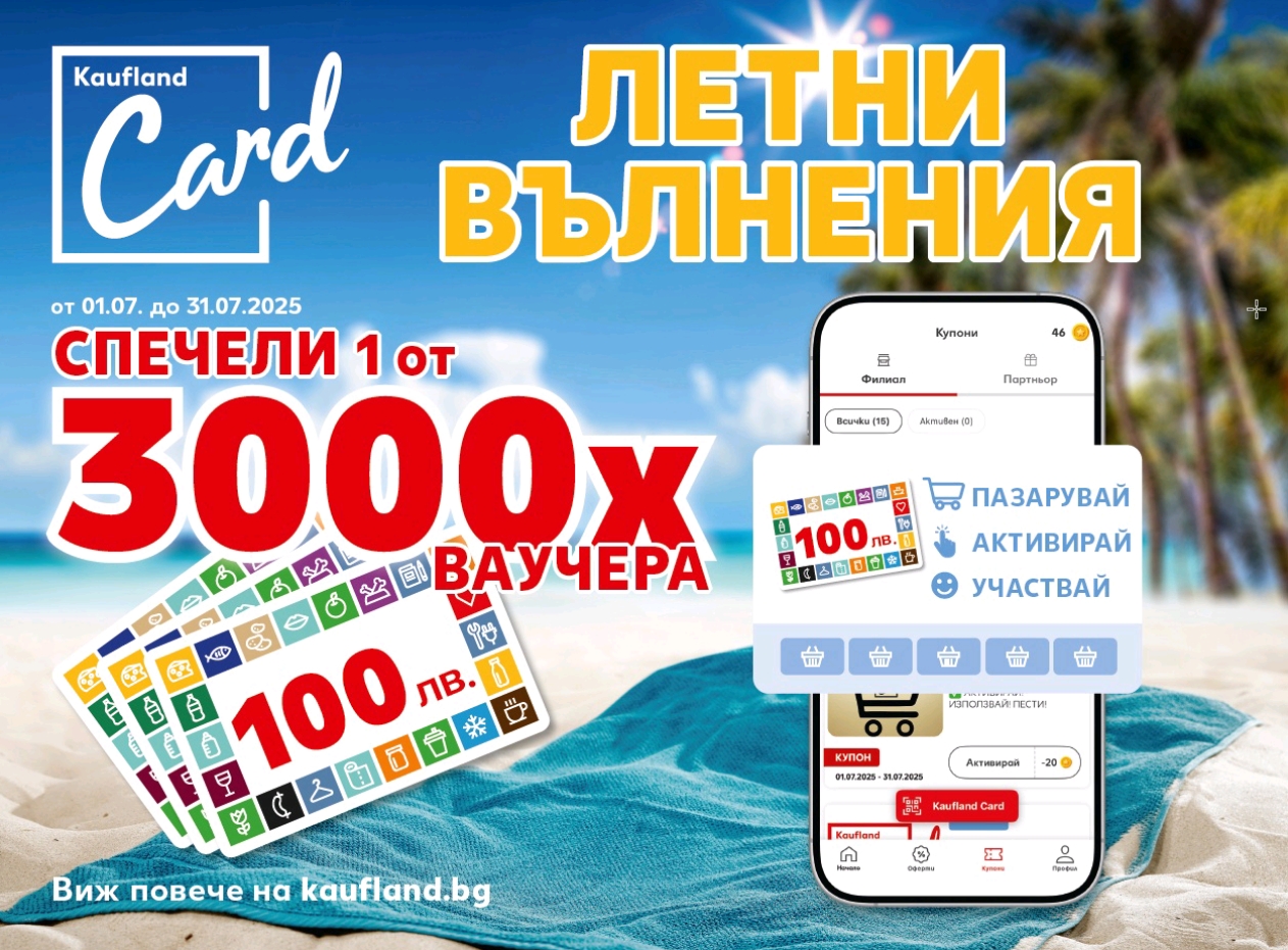 София, 10 юли 2025 г. – През целия месец юли Kaufland България дава шанс на своите лоялни клиенти да спечелят един от 3000 ваучера по 100 лв. Всеки регистриран потребител с активна Kaufland Card ще открие специален купон в своя профил. За да участва в играта, клиентът трябва да направи поне 5 пазарувания на стойност минимум 50 лв. до 31 юли. След изпълнение на условието, купонът ще се отключи и трябва да бъде активиран и оставен активен до края на кампанията, за да може потребителят да участва в тегленето на наградите.