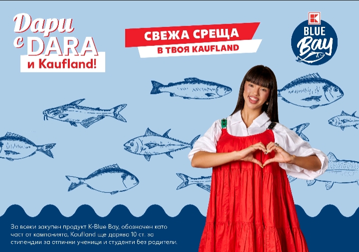 Kaufland насърчава клиентите си в цялата страна да се включат в набирането на средства за стипендии за отлични ученици и студенти без родители по линия на инициативата си „Дари с DARA и Kaufland”. За закупуването на който и да е от 4-те нови артикули под марката K-Blue Bay, които включват свежи риби и морски дарове, ритейлърът ще дарява фиксирана сума.