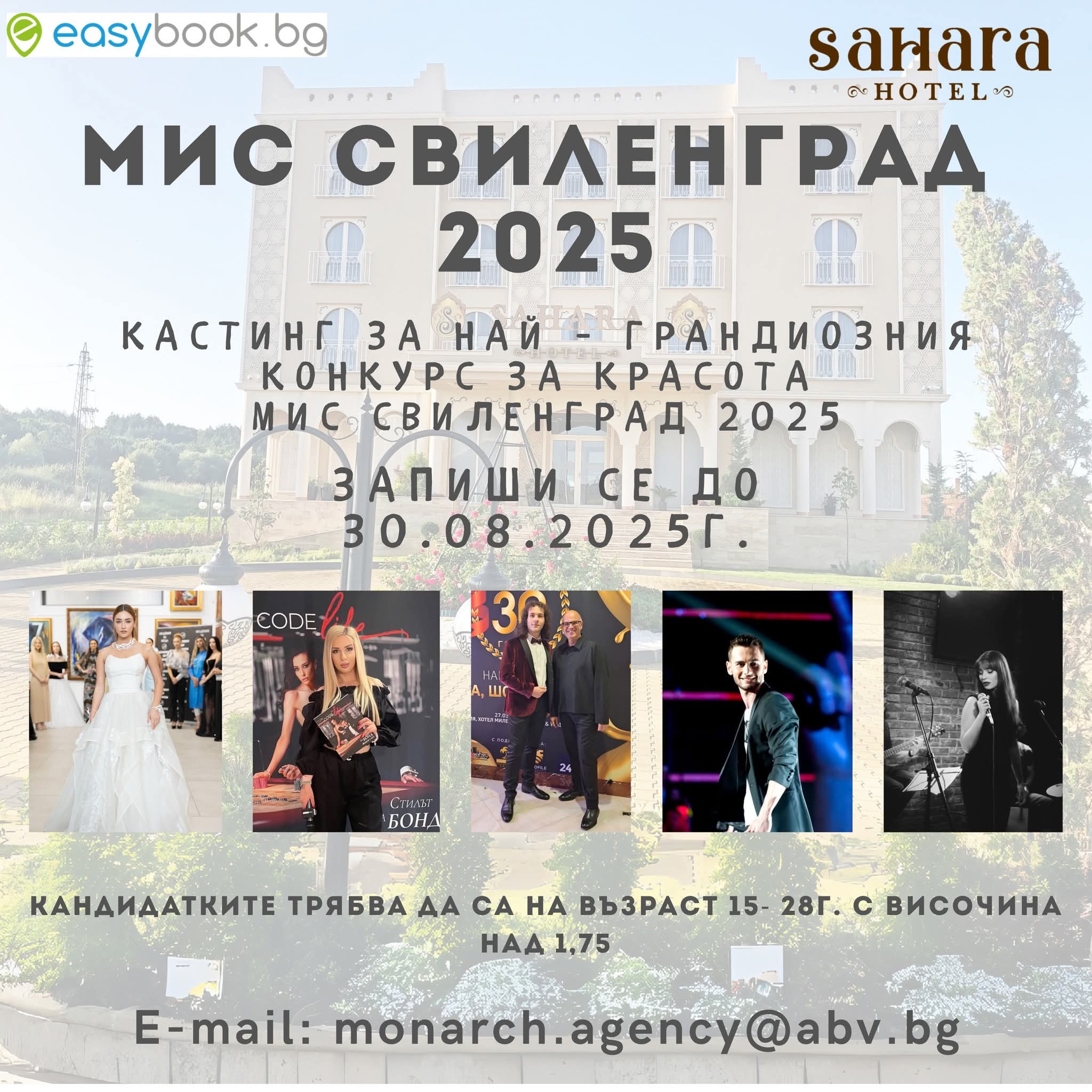Свиленград отново ще заблести под светлините на прожекторите с най-очакваното събитие на сезона – конкурсът за красота „Мис Свиленград 2025“, организиран от модна агенция „Монарх“. Конкурсът вече се утвърди като престижна платформа за млади и амбициозни момичета, които мечтаят за голямата сцена.