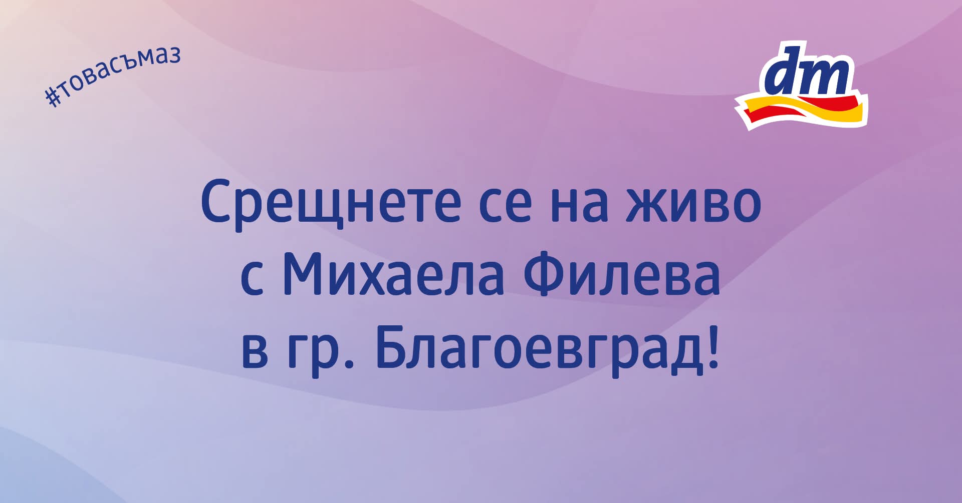 Популярната българска изпълнителка Михаела Филева ще зарадва своите почитатели с лична среща в Благоевград. Фен събитието ще се проведе на 21 януари 2026 година в dm магазин, намиращ се на ул. „Арсений Костенцев“ 7.