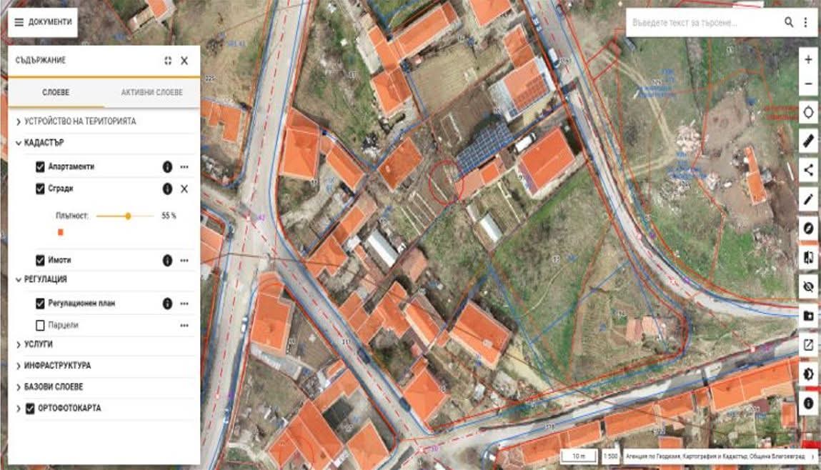 ГИС дава възможност за справки за конкретни имоти, зони или инфраструктура с видимост върху свързани регулации, ограничения и планове в реално време и без нужда от регистрация.