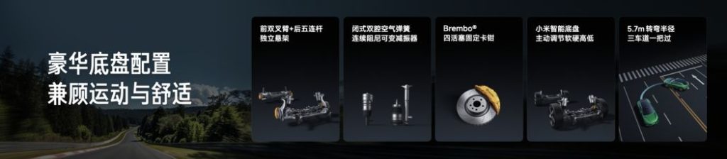 В допълнение към мощния двигател има и стабилно шаси. На първо място, по отношение на спирачната ефективност, най-краткият спирачен път на Xiaomi YU7 от 100 км/ч до 0 е 33,9 м, сравним с този на първокласен спортен автомобил. В същото време той разполага с четворен механизъм за безопасност при спиране, който носи по-стабилни и безопасни спирачни характеристики. Освен това, когато става въпрос за конфигурация на шасито, Xiaomi YU7 е оборудван с хардуер за шаси с по-висока спецификация, включително предно независимо окачване с двойни рамена + задно независимо окачване с пет рамена, затворена двукамерна въздушна пружина + непрекъснат контрол на амортисьорите, Brembo®️ четирибутални фиксирани спирачни апарати, интелигентно шаси Xiaomi и т.н. Радиусът на завиване е 5,7 м, с който може да се преминат три ленти с едно движение. По-специално, непрекъснатият контрол на амортисьорите точно отговаря на пътните условия, бързо регулира силата на амортизация и съчетава твърдост и гъвкавост за по-голям комфорт и спортност. Диапазонът на регулиране е с 10% по-голям от този на Xiaomi SU7 Max, а широчината на амортизационната лента е по-голяма, като покрива всички пътни условия, като например виещи се планински пътища, градски възвишения и крайградски пътища. Затворените двукамерни пневматични пружини поддържат 5 нива на регулиране на височината, с максимален диапазон на регулиране нагоре и надолу от 75 мм и максимален пътен просвет от 222 мм. В същото време твърдостта на въздушните пружини също може да се регулира бързо, като разликата между високата и ниската степен на твърдост е над 40%, което кара водачите да се чувстват по-комфортно, като същевременно запазват усещането за пътя за тях.