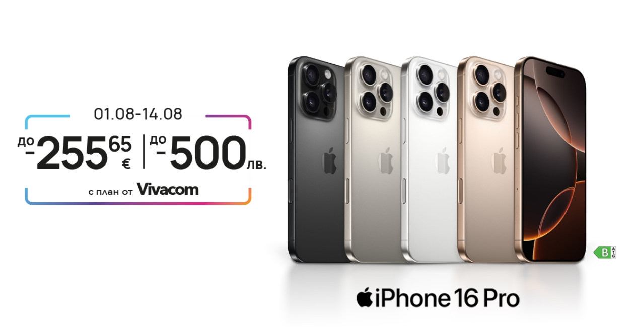 Vivacom дава старт на нова онлайн кампания с изключително изгодни предложения за феновете на Apple. Само до 14 август iPhone 16 Pro може да бъде закупен с отстъпка до 500 лв. от цената в комбинация с 24-месечен договор за план Unlimited от Vivacom. Промоцията е валидна само онлайн на vivacom.bg