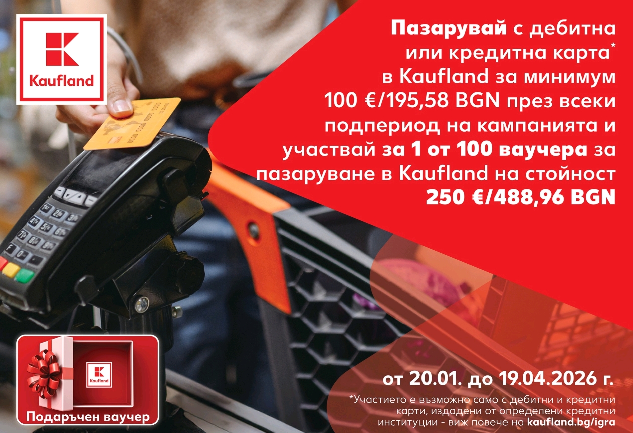 Kaufland стартира нова кампания, която насърчава картовите разплащания при пазаруване и дава шанс на клиентите да спечелят ваучери за пазаруване, всеки на стойност 250 евро (488,96 лева). В периода от 20 януари до 19 април 2026 г. всеки клиент, който извърши една или повече покупки в магазин на веригата на обща стойност минимум 100 евро (195,58 лв.) през поне един от периодите на кампанията и заплати с една и съща дебитна или кредитна карта, или с ваучер за храна на електронен носител, издадени от партнираща банка*, може да участва в играта. Участието е възможно неограничен брой пъти.