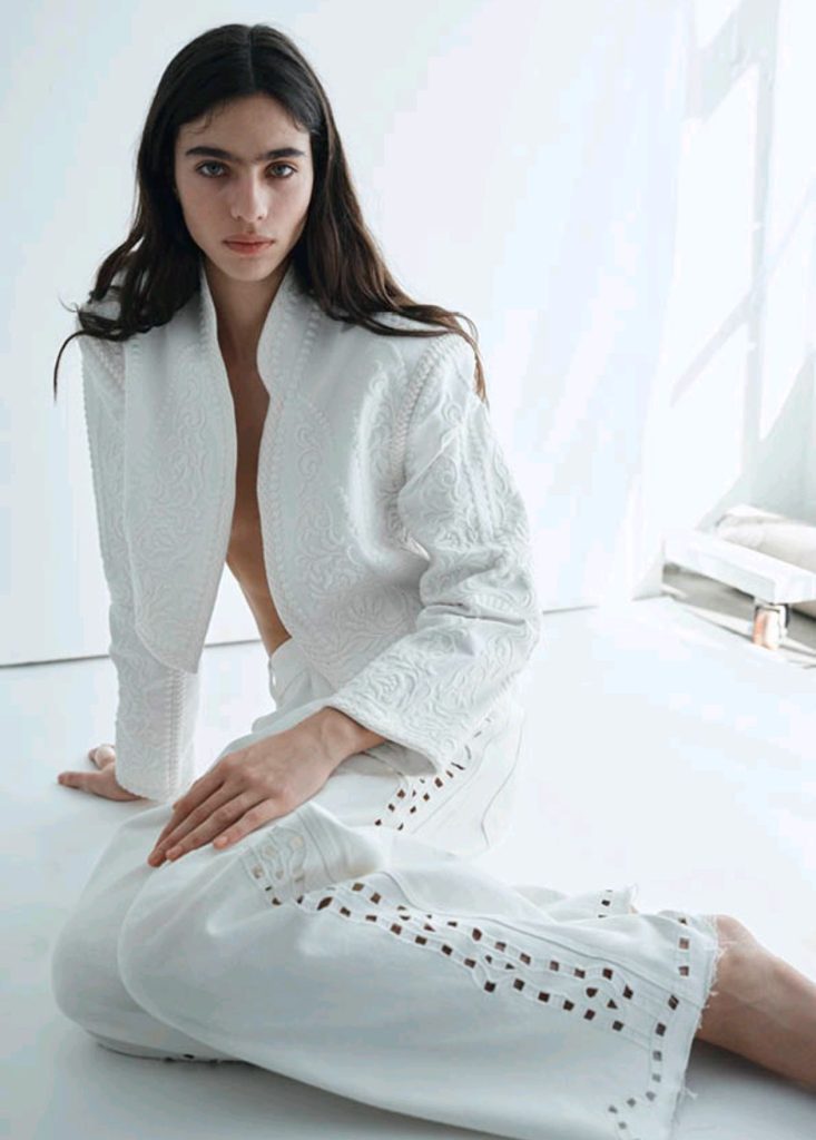 Акцент в колекцията са богатите бродерии и изразителните текстури, които придават характер на ключовите модели – топове с ресни, ефирни полупрозрачни рокли, елеци и фино изработени блузи. Тази декоративна мекота е балансирана от деним и изчистени кожени силуети, включително къси якета с графични линии, анораци и бермуди. Костюмите от ленени смеси допълват визията с модерна елегантност и лекота.