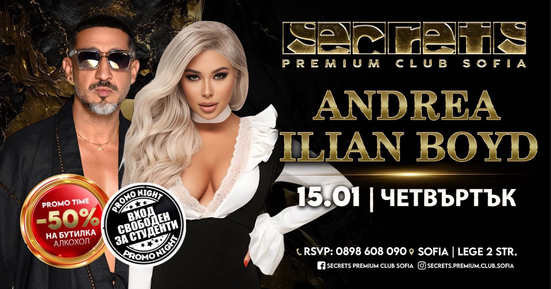 Този четвъртък, 15 януари, столичният SECRETS CLUB се готви за една от най-обсъжданите нощи в началото на годината. На сцената ще се качат Илиян Бойд и Андреа, които обещават шоу с много енергия, провокация и истинска клубна атмосфера.