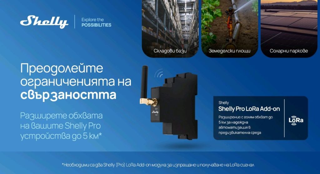 През месец март Shelly Group ще разшири линията си LoRa с нов модул – Shelly PRO LoRa Add-on, който революционизира обхвата на съвместими Shelly Pro устройства до 5 километра (при оптимални условия) чрез радиотехнологията LoRa. Решението е проектирано за стабилна работа в екстремни и труднодостъпни среди, включително производствени бази, соларни паркове, земеделски площи, системи за улично осветление и отдалечени обекти.
