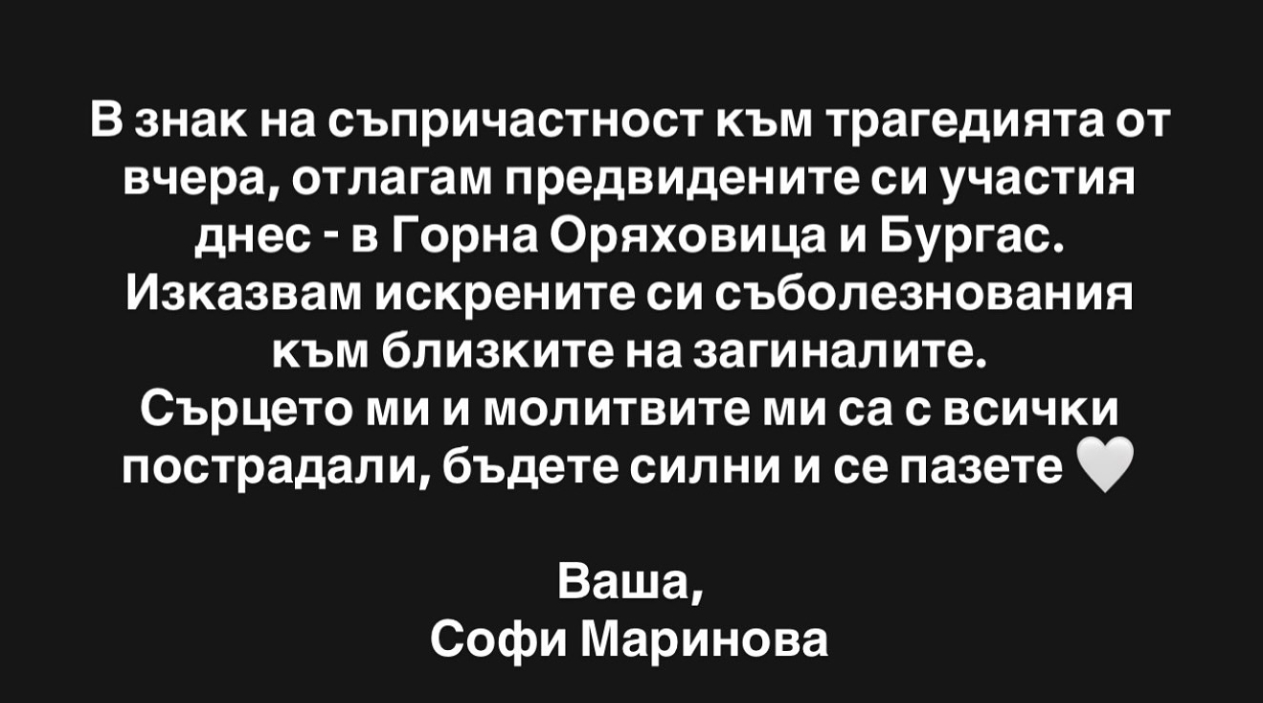 Голямата Софи Маринова, известна с емоцията, с дълбоките си песни и човеческата си топлота, обяви, че отменя своите планирани участия в Бургас и околните места. В съобщението си тя посочва, че го прави „в знак на съпричастност към трагедията”, посочвайки, че в района са се случили сериозни наводнения и поройни валежи, които вече нанасят щети на домакинства и инфраструктура, както и отнеха животи.