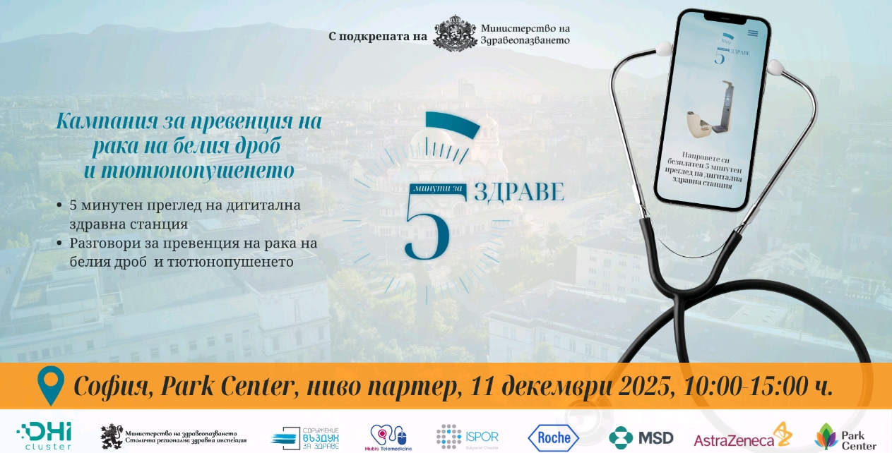 Безплатни изследвания на основни здравни показатели и функцията на белия дроб чрез съвременни дигитални технологии ще се проведат на 11 декември 2025 г. (четвъртък) в София от 10.00 до 15.00 часа в мол Park Center Sofia /бул. „Арсеналски“2/, ниво партер. Те са част от кампанията „5 минути за здраве“, която се организира от Българския клъстер за дигитални решения и иновации в здравеопазването с подкрепата на Министерството на здравеопазването, в партньорство със Сдружение „Въздух за здраве“, телемедицинската компания Хъбис, биотехнологичната фармацевтична компания Рош България и биофармацевтичните компании АстраЗенека и MSD, ISPOR Bulgarian Chapter, Столична РЗИ и мол Park Center Sofia.