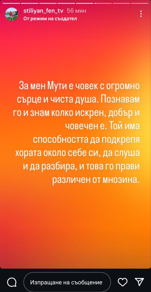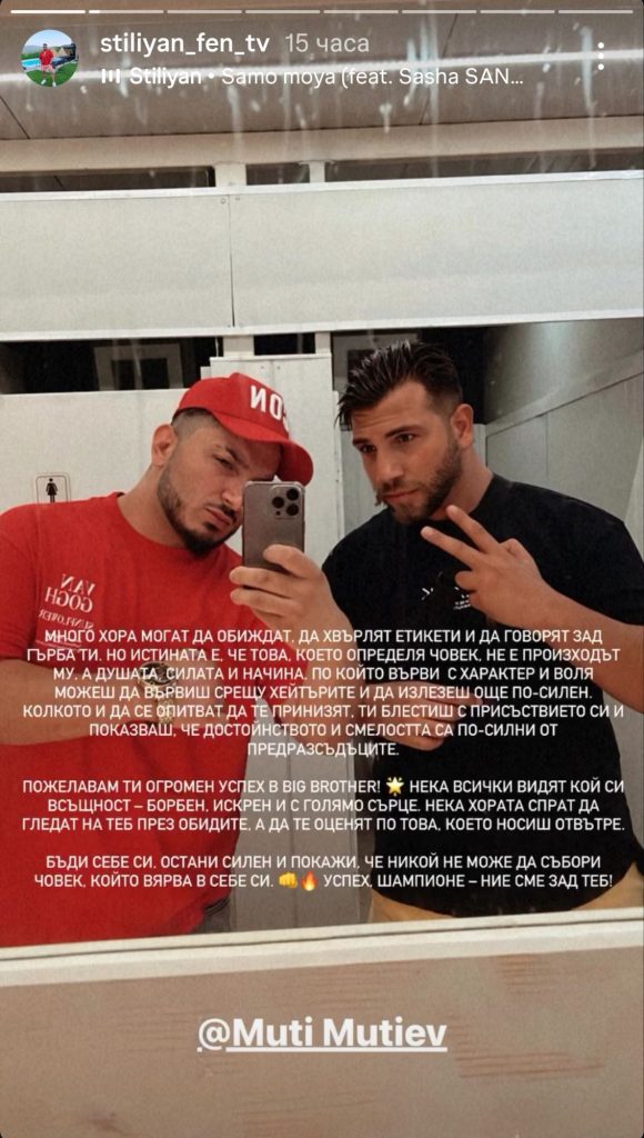 Стилиян описва Мути като „човек с огромно сърце и чиста душа“, който винаги умее да подкрепя хората около себе си и да показва разбиране. „Знам колко искрен, добър и човечен е. Той заслужава шанс, както всички ние заслужаваме уважение“, подчерта изпълнителят.