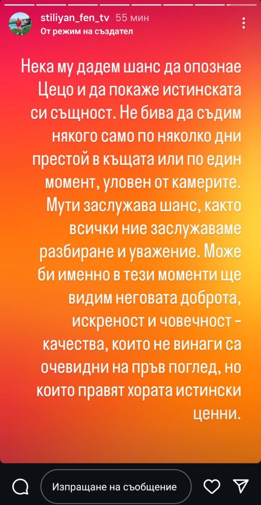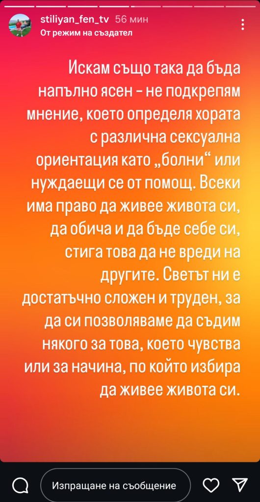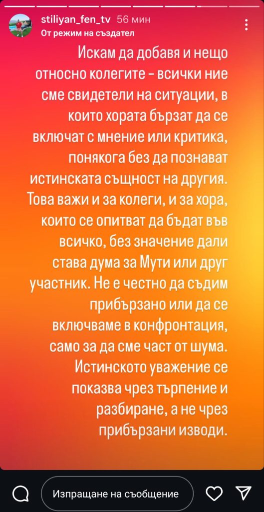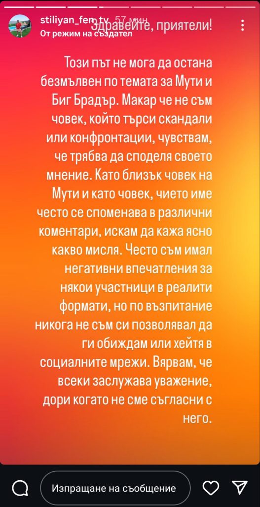 „Не съм човек, който търси скандали или конфронтации, но чувствам, че е време да споделя своето мнение. Вярвам, че всеки заслужава уважение, дори когато не сме съгласни с него“, казва Стилиян.