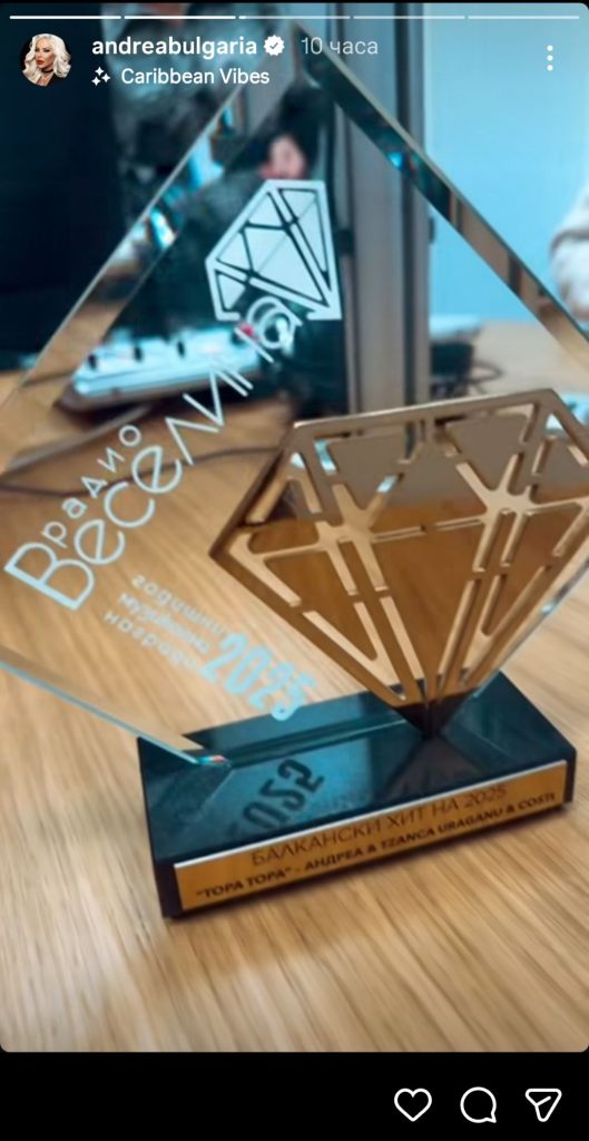 В света на шоубизнеса има имена, които не просто следват тенденциите, а ги създават. Андреа отдавна е доказала, че българската сцена е твърде тясна за нейния размах, а последният ѝ успех е поредното потвърждение за международния ѝ статут. На тазгодишните Годишни музикални награди на Радио Веселина, проектът „Топа, топа“ (колаборация с румънските мегазвезди Costi и Tzanca Uraganu) бе безапелационно избран от публиката за „Балкански хит на 2025 година“.