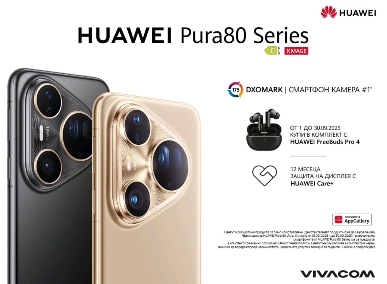 От 1 до 30 септември 2025 г. клиентите на Vivacom ще могат да закупят флагманите в комплект с безжичните слушалки Huawei FreeBuds Pro 4, както и с 12-месечна защита на дисплея Huawei Care+. Офертата е валидна както онлайн на vivacom.bg, така и във всички магазини на Vivacom – при покупка с 24-месечен договор за план Unlimited.