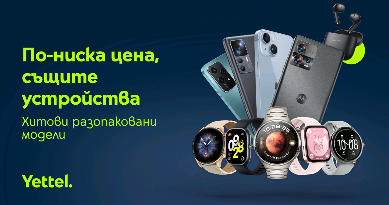До края на месец март Yettel предлага специална аутлет селекция от 50 модела разопаковани устройства на значително по-достъпни цени. Офертата е налична само в електронния магазин на оператора, като поръчките могат да се направят и директно през приложението Yettel. Устройствата могат да бъдат закупени както с еднократно плащане, така и на лизинг, а при смартфоните предложението е валидно при комбиниране с мобилни планове Total и Total Unlimited. Кампанията е активна в периода от 11 до 31 март 2026 г. или до изчерпване на количествата.